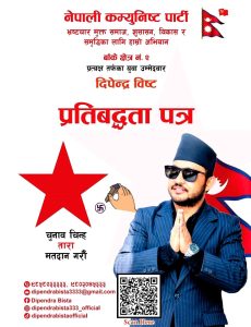 नेपालगन्ज, फागुन ३ । नेपाली कम्युनिष्ट पार्टीबाट बाँके क्षेत्रनं २ का उम्मेदवार दिपेन्द्र विष्टले आईतबार एक कार्यक्रमका बिच आफ्नो प्रतिबद्धता पत्र सार्वजनिक गरेका छन् । भ्रष्टाचार मुक्त समाज, शुसासन, विकास र समृद्धिका लागि हाम्रो अभियान भन्ने मुल उदेश्य राखेर विष्टले विभन्न १४ बुदे प्रतिबद्धता पत्र सार्वजनिक गरेका हुन् ।