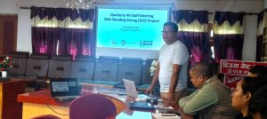 एम एन्ड इ अफिसर धिरज चौधरीले डाटा प्रविष्टिमा देखिएका त्रुटि तथा सुधारका उपायबारे जानकारी दिनुभएको थियो भने बिजय शर्माले त्रैमासिक उपलब्धि, सिकाइ तथा कार्यान्वयनका चुनौतीहरू प्रस्तुत गर्नुभएको थियो ।